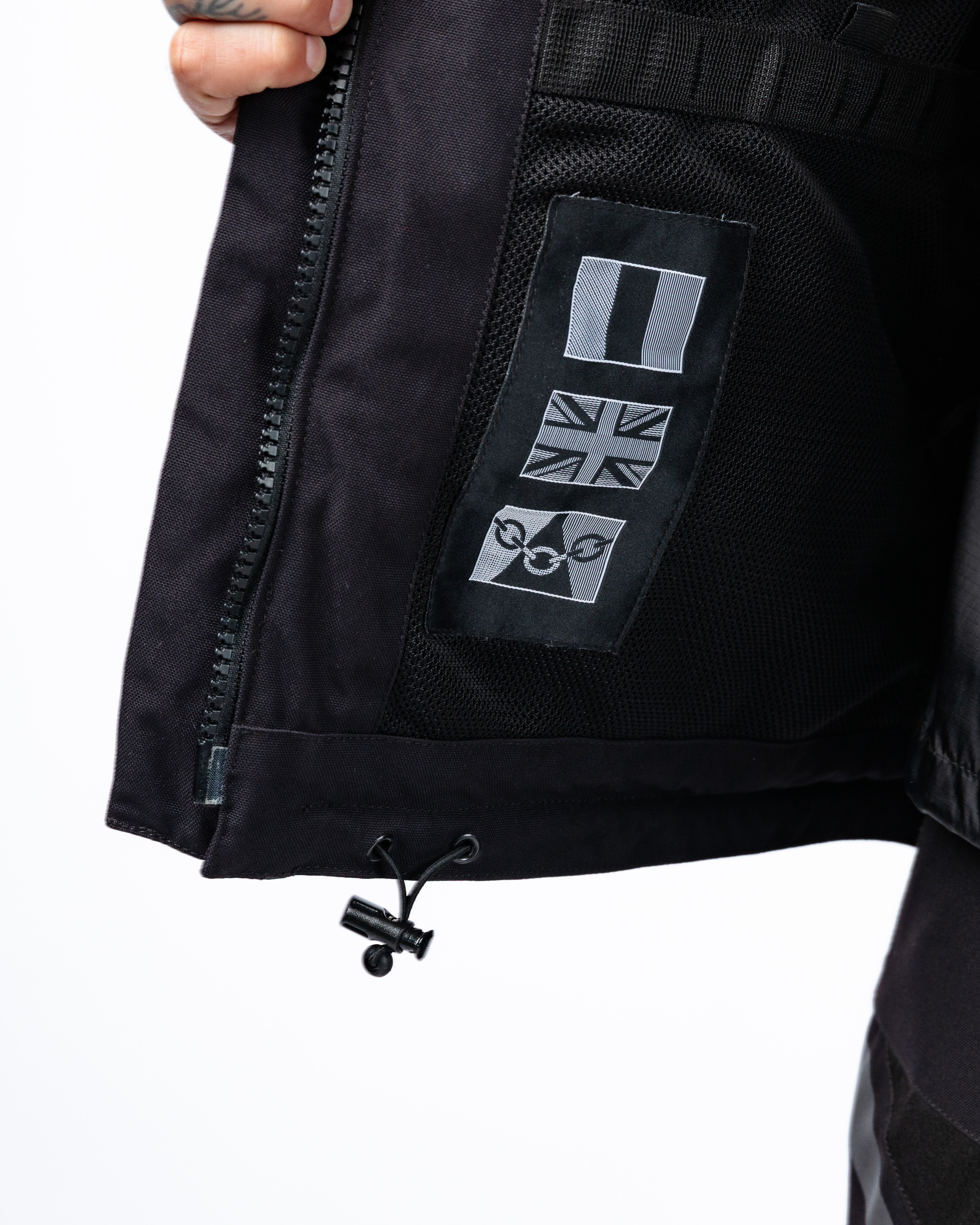Storage is extensive, with two large internal stow pockets, one waterproof internal chest pocket, and a tactical pocket configuration totalling 10 pockets. Fit adjustment is managed through stud-fastened sleeve width adjusters, hook & loop waist and cuff adjustment, and an elasticated drawcord with zipper-fastened hem adjustment.