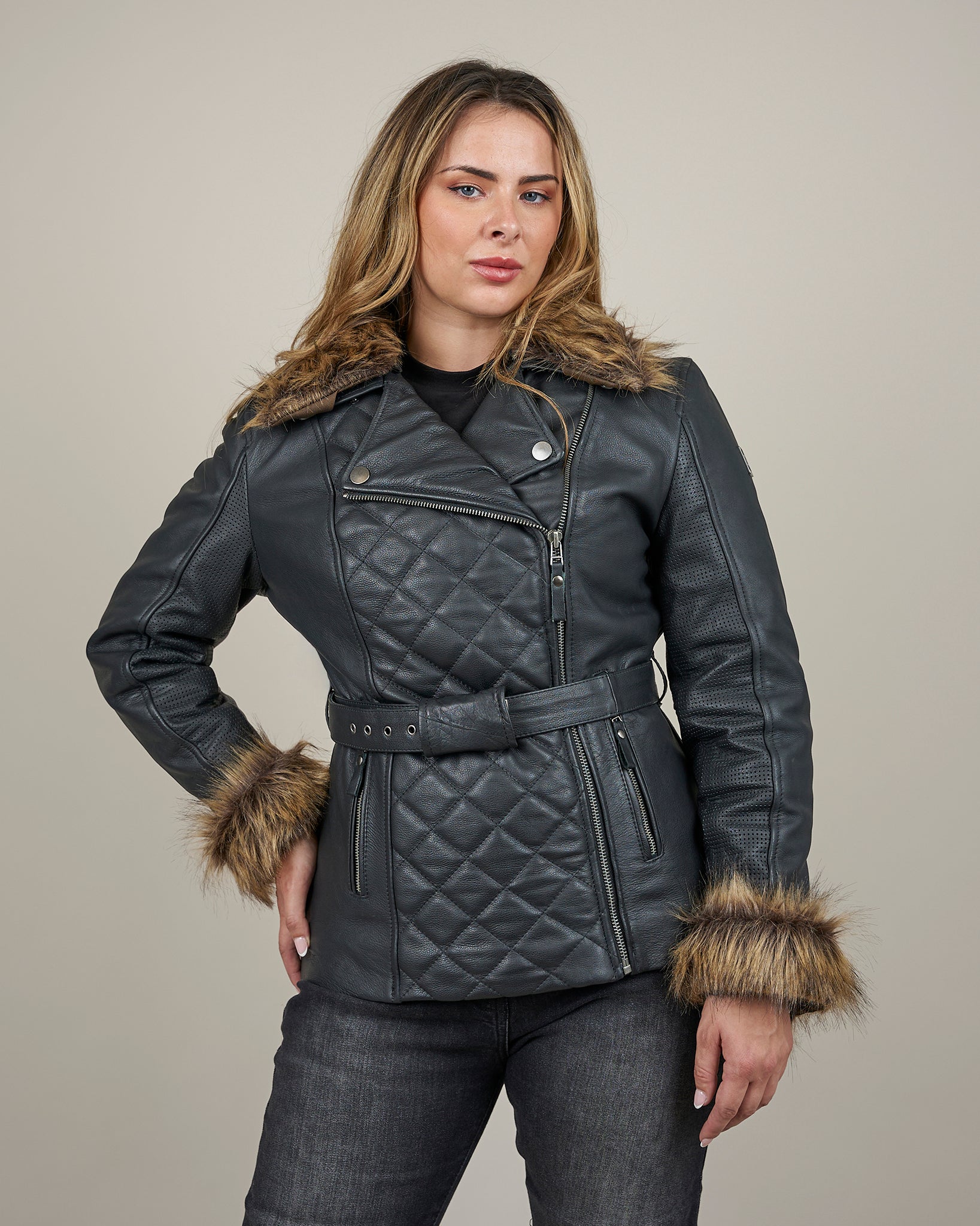 The Lancer is a women’s leather motorcycle jacket designed for riders who want to feel powerful, protected, and effortlessly stylish. Inspired by the iconic Spada Hartbury, it redefines biker style with premium craftsmanship and versatile detailing, from the sleek lancer front to the detachable faux fur collar, cuffs, and waist belt that let you customise your look, your way.