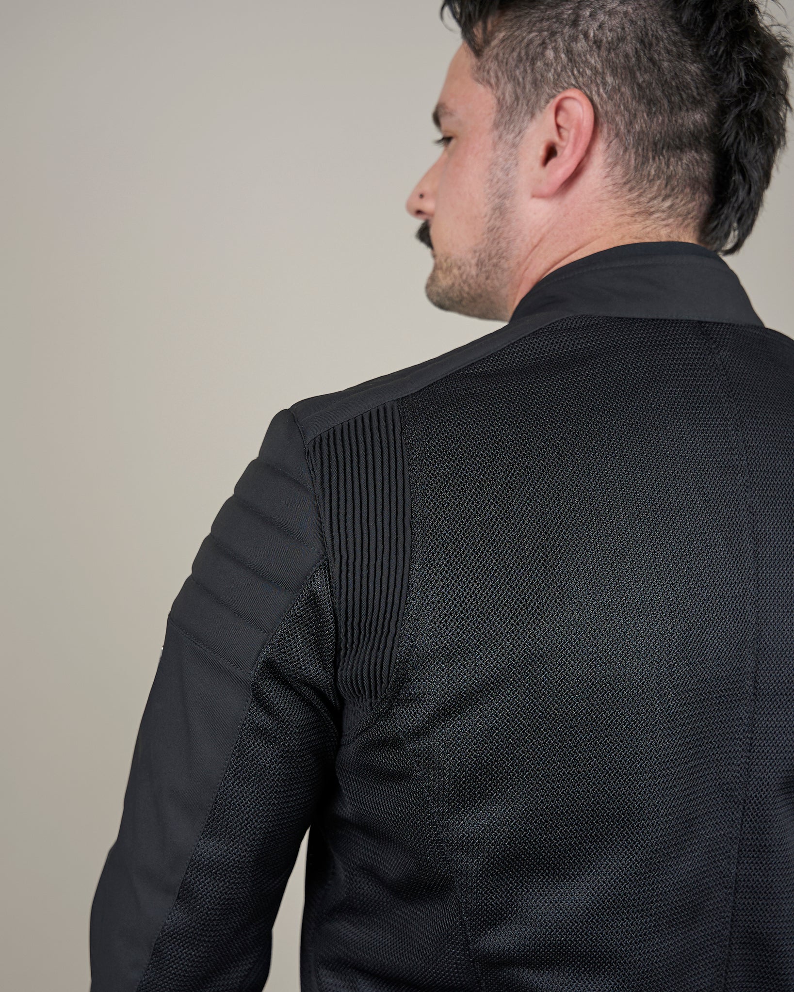Lightweight yet protective, the Cafe Air features CE-approved armour at the shoulders and elbows, plus stretch panels behind the arms for enhanced mobility in a tucked riding position. Its sleek black silhouette and retro detailing make it a standout both on and off the bike.